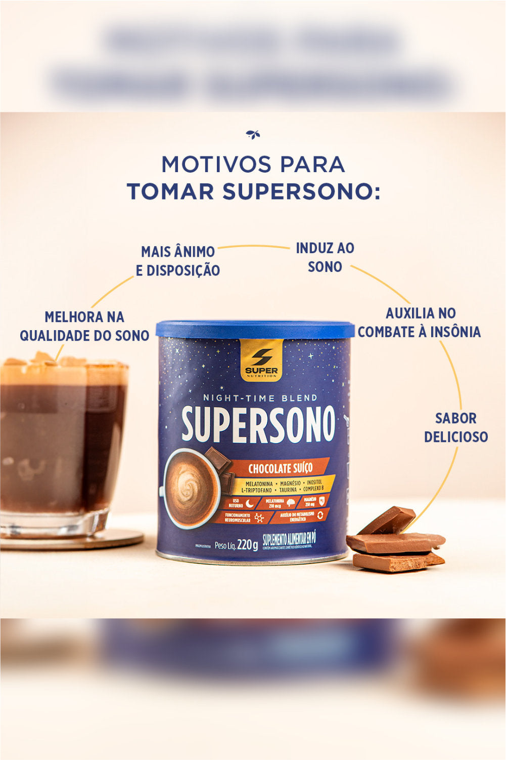Con un delicioso sabor a chocolate suizo, la fórmula SUPERSONO contiene Melatonina, Magnesio, L-triptófano y otros súper ingredientes.